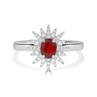 Designed With 14K White Gold For A Richer Finish, This Enchanting Ring Is Set With A Magnificent Oval Cut Ruby. Bordered By Exclusive Round Cut Diamonds, Wear This Ring To Any Event To Make A Lasting Impression.