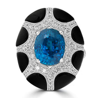 Add a little twist in your style every time you adorn this grand 18K white gold ring. Designed to perfection, the unmatched glow of this classy ring comes from the oval-cut blue Zircon that is surrounded by glittering round Diamonds.