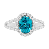 Designed With 14k White Gold And Set With Oval Cut Blue Zircon By Eccentrically Patterned Round Cut Diamond. This Fashion Statement Ring Is The Ultimate Trendsetter Among The Fashionistas And Melted Magic That Bedazzles On Any Occasion.