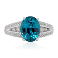 Designed with a marvelous oval cut Blue Zircon, the beauty of this gemstone leaves a lasting impression wherever you go. This captivating ring is further accentuated by the glittering round cut Diamonds which draw focus to its bright color. Crafted in 14K white gold, the endless shimmer of this ring is truly magnificent!