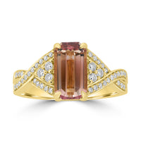 Meticulously crafted, this 18K yellow gold ring showcases a modern design with a world-class aesthetic. Adorned with captivating emerald-cut Tourmaline and dazzling Diamonds, it exudes luxury and class. Wear it to elevate your style!