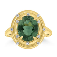 This 18K yellow gold ring defines timeless charm, showcasing the natural beauty and radiance. Its high-class design adds drama to its look, complemented by the refined radiance of oval-cut Tourmaline and round Diamonds. Perfect for formal parties and family functions.