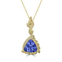Crafted with 18K yellow gold, this gorgeous pendant is embellished with a trillion-cut Tanzanite and stunningly beautiful round Diamonds that sparkle to bring out its ultimate beauty, making it an exquisite piece of jewelry.