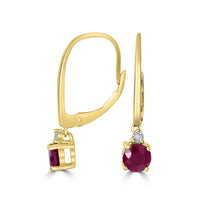 Set with a gorgeous round cut Ruby at the center, this eye-catching pair of earrings are crafted of 14k yellow gold and surrounded by the sparkle of round-cut Diamonds for an endless shine.