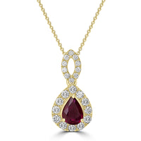 Fashioned from 14k yellow gold, this excellent pendant is studded with pear-cut Ruby and round Diamonds that shimmer and shine in the light.