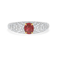 Crafted Of 18K Two Tone Gold, This Alluring Ring Is Perfect For Any Occasion. Designed With A Stunning Oval Cut Ruby, It Is Bordered By The Glitter And Shimmer Of Round Cut Diamonds Which Proffer A Mesmerizing Effect.