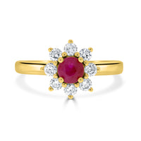 Set With An Eye-catching Round Cut Ruby, The Brilliance Of This Gemstone Is Accentuated Further By The Radiance Of The Round Cut Diamonds That Surround It. Crafted Of 14k Yellow Gold For Extra Richness, This Elegant Ring Goes With Any Ensemble For Added Glamour.