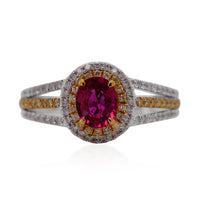 Crafted from 14k-22k two-tone gold, this ring will add to your style statement. This attractive ring is the flavor of the season. Studded with Oval Ruby and round diamonds, this ring serves as a charming addition to your jewelry collection.