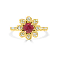 Crafted Of 18K Yellow Gold, The Richness Of This Splendid Ring Is Accentuated By The Deep Shade Of The Round Cut Ruby At Its Center. Encircled By Glittering Round Cut Diamonds, This Fine Jewelry Is Perfect For Any Occasion.