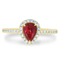 Set With A Sparkling Pear Cut Ruby, The Gorgeous Hue Of This Gemstone Is Elevated By The Shine Of The Round Cut Diamonds. Designed With 18K Yellow Gold, This Sensational Ring Gives You The Perfect Look Each Time.