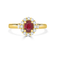 Designed With An Eye-Catching Oval Cut Ruby, This Enchanting Ring Is Designed With 14K Yellow Gold For Extra Luster. Surrounded By The Shimmer Of Mix Cut Diamonds, Wear This Ring To Any Occasion To Make An Unforgettable Impression.