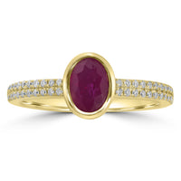 This ring is specially crafted by experienced craftsmen to create a high-class design. Designed with timeless craftsmanship, this mesmerizing 14K yellow gold ring is set with a gorgeous oval-cut Ruby and round Diamonds that spread a marvellous glow. Wear it to redefine your style!