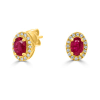 Crafted from 14k yellow gold, this attractive pair of earrings are set with with an eye-catching oval-cut Ruby and radiant round Diamonds.