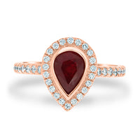 Designed With A Magnificent Pear Cut Ruby, The Excellent Craftsmanship Of This Ring Is Highlighted By The Shimmer Of The Round Cut Diamonds Around It. Designed With 14K Rose Gold, It Is The Perfect Jewelry For Any Occasion.