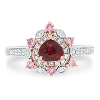 Designed With A Spectacular Heart Cut Ruby, The Glow Of This Captivating Ring Is Enhanced By The Shimmering Round Cut Diamonds Around It. Crafted Of 18K Two Tone Gold.