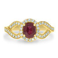 Designed With An Eye-Catching Oval Cut Ruby, The Glorious Shade Of The Gemstone Is Further Enhanced By The Gorgeous Round Cut Diamonds That Encircle It. Crafted Of 18K Yellow Gold, This Captivating Ring Is Perfect For Any Occasion.