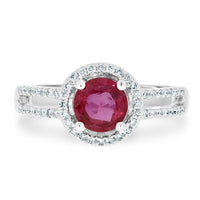 Crafted Of 14K White Gold, The Beauty Of This Gorgeous Ring Is Accentuated By The Brilliant Round Cut Ruby At Its Center. Surrounded By Glittering Round Cut Diamonds, This Spectacular Ring Spreads A Magnificent Glow That Can'T Be Missed.
