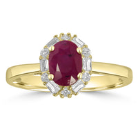 This luscious ring is crafted of 14k yellow gold for a rich finish. The scrupulous design that is embellished with oval-cut Ruby and round Diamonds make this ring a sparkling accessory. A world-class design to make your outfit a charming ensemble!