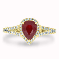 The Richness Of The Yellow Gold And Luxury Style Makes This Ring The Best Option For Parties, Special Occasions And Festival Looks. A Pear-cut Ruby Is Set Amidst Shining Round Diamonds For A Mesmerizing Look.