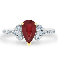 The Striking Beauty Of This 14K Two-Tone Gold Ring That Is Embellished With Pear-Cut Ruby Makes It The Perfect Piece That Fit For Royalty. To Add More Shine To The Piece, Round-Cut Diamonds Are Set On Both The Side In A Fabulous Pattern.