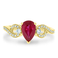Crafted Of 14K Yellow Gold, The Rich Finish Of This Splendid Ring Is Accentuated By The Fabulous Pear Cut Ruby. Surrounded By Sparkling Round Cut Diamonds, The Endless Radiance Of This Fine Jewelry Is Truly Unmatched.
