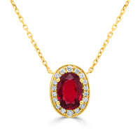This stylish 14K yellow gold necklace is set with an oval-cut Ruby and round Diamonds.