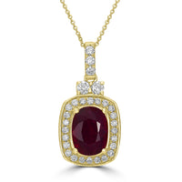 This luxury-style 14K yellow gold pendant is perfect for tapping into today's trend or for gifting to a special friend. Set with an eye-catching cushion-cut Ruby, the color of the gemstone is accentuated by the radiance of the round Diamonds.