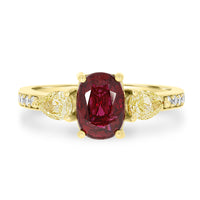 Crafted Of 18K Yellow Gold For A Rich Look, This Stunning Ring Is Designed With A Gorgeous Oval Cut Ruby. Its Radiance Is Highlighted By The Dazzling Mix Cut Diamonds That Surround It, Spreading An Everlasting Brilliance.