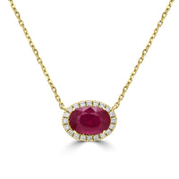This classy 14K yellow gold pendant is designed with an eye-catching oval-cut Ruby, the color of the gemstone is paired with radiant round Diamonds.