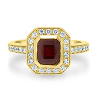 Designed With Lustrous 18K Yellow Gold, This Marvelous Ring Is Designed With A Stunning Princess Cut Ruby And Bordered By The Shimmer And Brilliance Of Glittering Round Cut Diamonds.