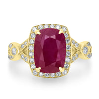 This eye-catching 14K yellow gold ring is set with a stunning cushion-cut Ruby and sparkling, round Diamonds around it. A world-class design!