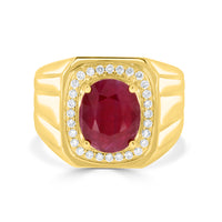 Crafted from 14K yellow gold, this marvelous ring is set with an eye-catching oval cut Ruby at its center. Encircled by round cut Diamonds, this ring features a timeless charm.