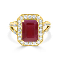 Designed With 14K Yellow Gold For A Rich Look, This Exclusive Ring Is Designed With A Gorgeous Princess Cut Ruby. Enhancing The Hue Of The Gemstone Are The Stunning Round Cut Diamonds, Which Add A Generous Dose Of Sparkle.