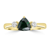 Crafted with 18K yellow gold, this stunning ring features an elegant design with trillion-cut Tsavorite and round Diamonds. Its exquisite craftsmanship and timeless beauty create a perfect blend of sophistication and classic style.