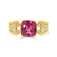 Designed with radiant 14K yellow gold, this luxurious ring is all you need to leave an unforgettable impression. Set with an eye-catching cushion cut Rubelite and encircled by splendid round cut Diamonds that give it a luxurious sparkle.