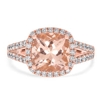 Set with cushion cut Morganite and round cut Diamonds, this magnificent ring is a must-have for fashionistas. Artistically designed of 14K rose gold, this stunning ring is treasured for its natural beauty and radiance that gives you a mesmerizing look.
