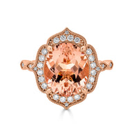 The world-class design and the glory of 14k rose gold make you fall in love with this ring. The oval cut Morganite provides maximum brilliance to the piece while round Diamonds provide added shimmer to enhance the luxury.