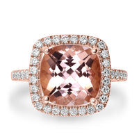 "Crafted in 14k rose gold, this ring is designed with a gorgeous cushion-cut Morganite and round Diamonds that play with the light."