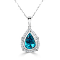 Set with a marvelous pear cut Blue Zircon, this gemstone is enhanced by round cut Diamonds surrounding it. Designed with 14K white gold, this enchanting pendant will catch eyes.